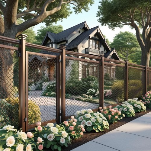 Low angle view of a green chain link fence with flowers around it and a nice house in the background in Camas.