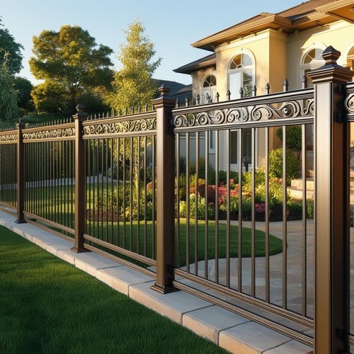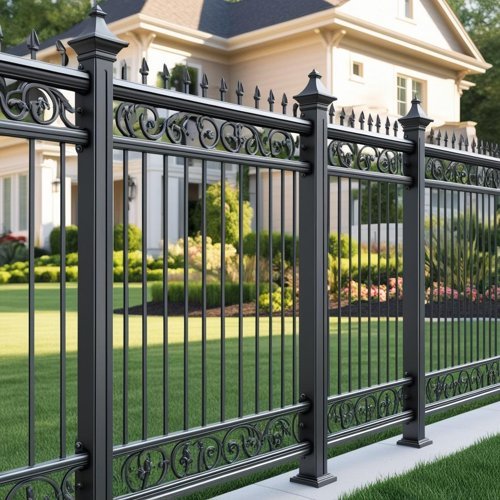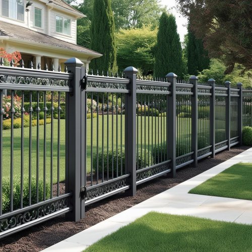 A tall strong wrought iron fence in a beautifully landscaped yard in Camas.